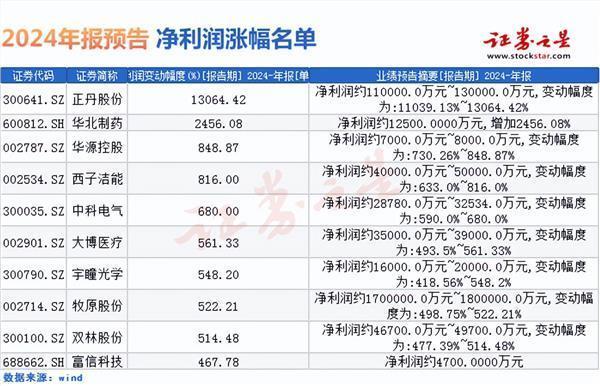 从预告净利润增幅的数据来看,46家公司预计全年净利润增幅将超过50%,这一数字彰显了这些公司在过去一年中的卓越表现和强劲的发展势头。其中,正丹股份、华北制药、华源控股三家公司更是脱颖而出,预计净利润增幅分别达到惊人的13064%、2456.08%、848.87%,成为了市场关注的焦点。