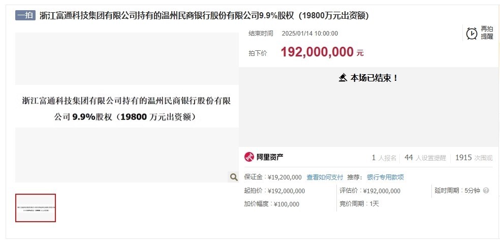 阿里司法拍卖平台显示,本次拍卖的标的为浙江富通科技集团有限公司(以下简称“富通科技”)持有的温州民商银行9.9%股权。富通科技作为温州民商银行的发起股东之一,原始出资额为1.98亿元。根据温州民商银行2024年三季度报告,富通科技持有的这部分股权已被法院裁定冻结,冻结期限为三年。